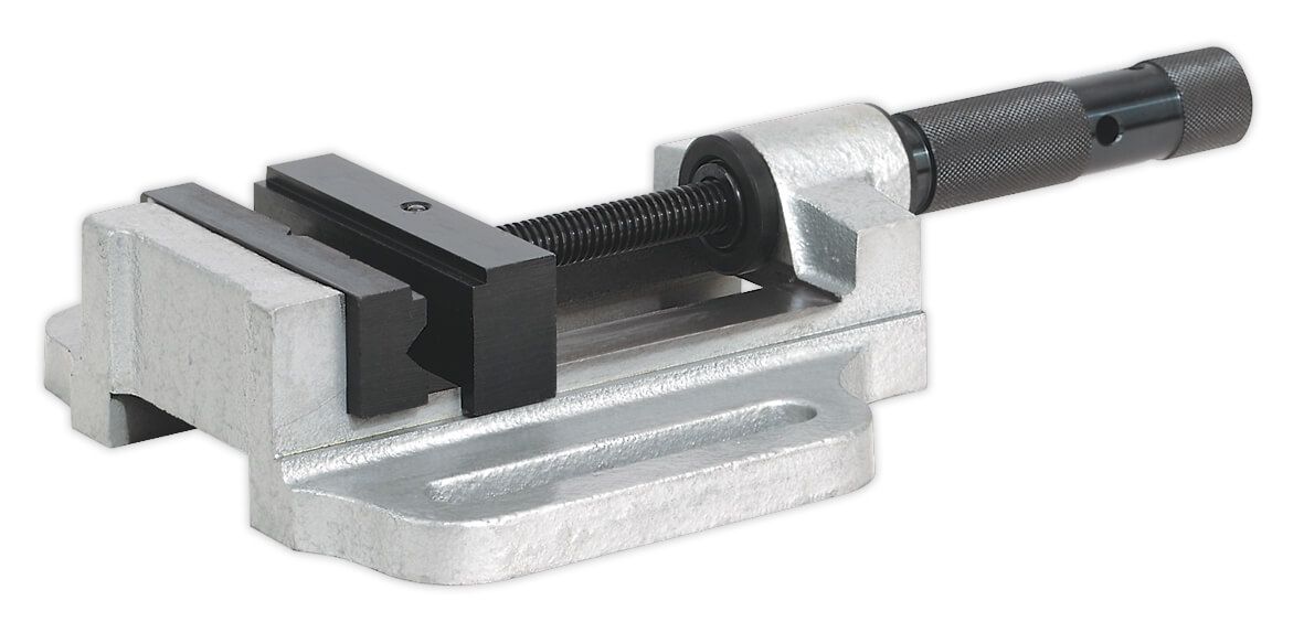 Steel construction with stepped jaws and machined foot suitable for hand-held use or for drill table mounting using two bolt-slides machined into the casting.