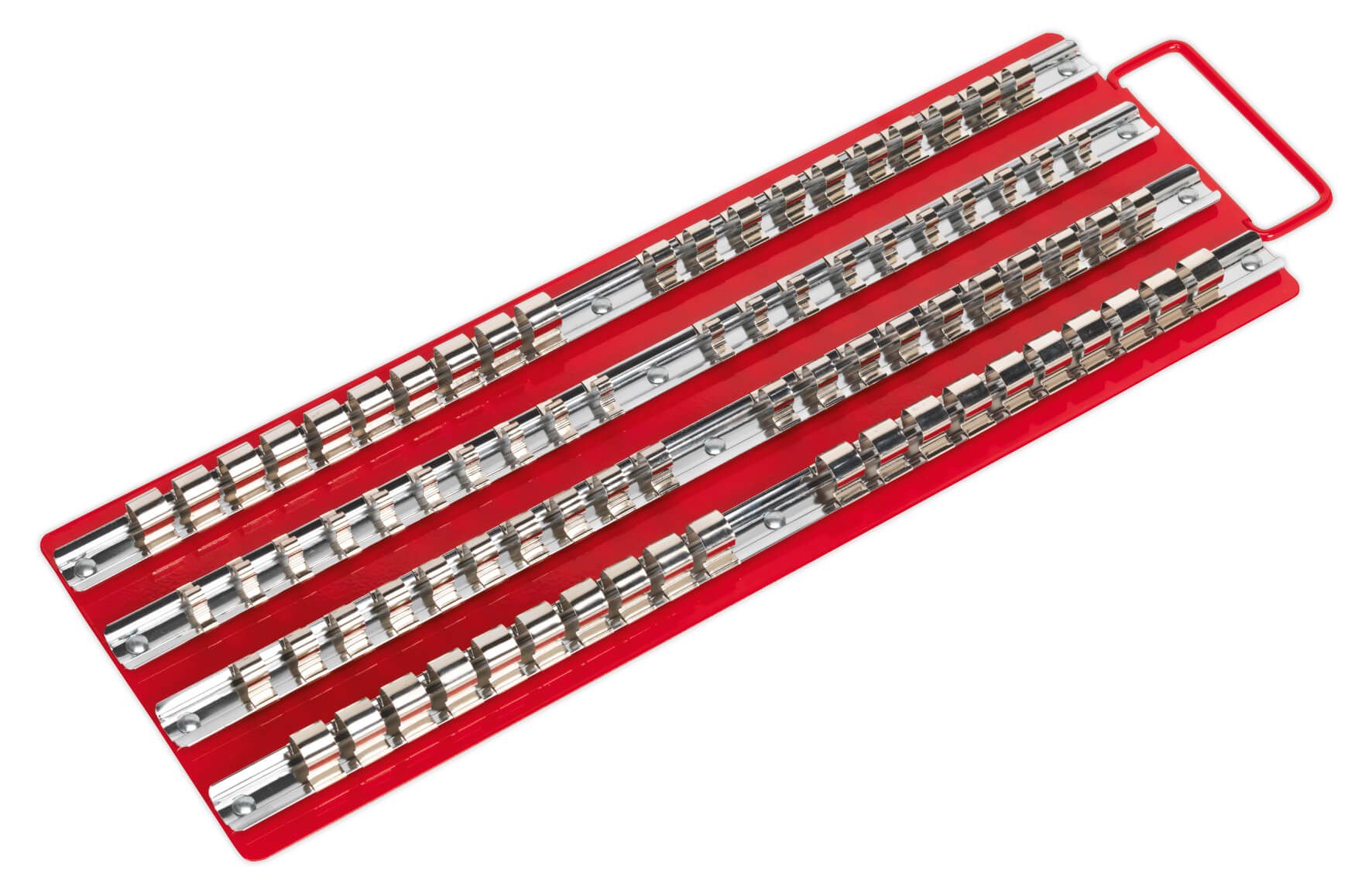 - Steel panel comprising of four 430mm rails and clips suitable for retaining 1/4", 3/8" and 1/2"Sq drive sockets.