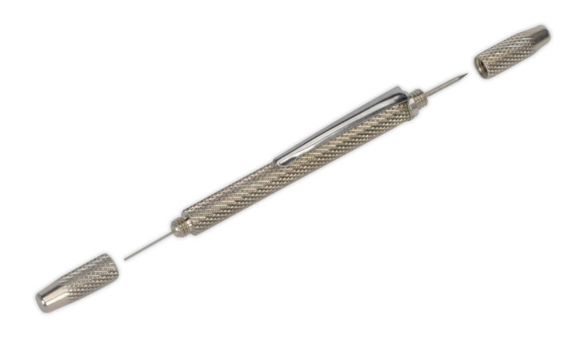 - Screwed caps house a pointed scribe for cleaning and clearing washer jets at one end and finer probe for adjusting position of jets at the other.