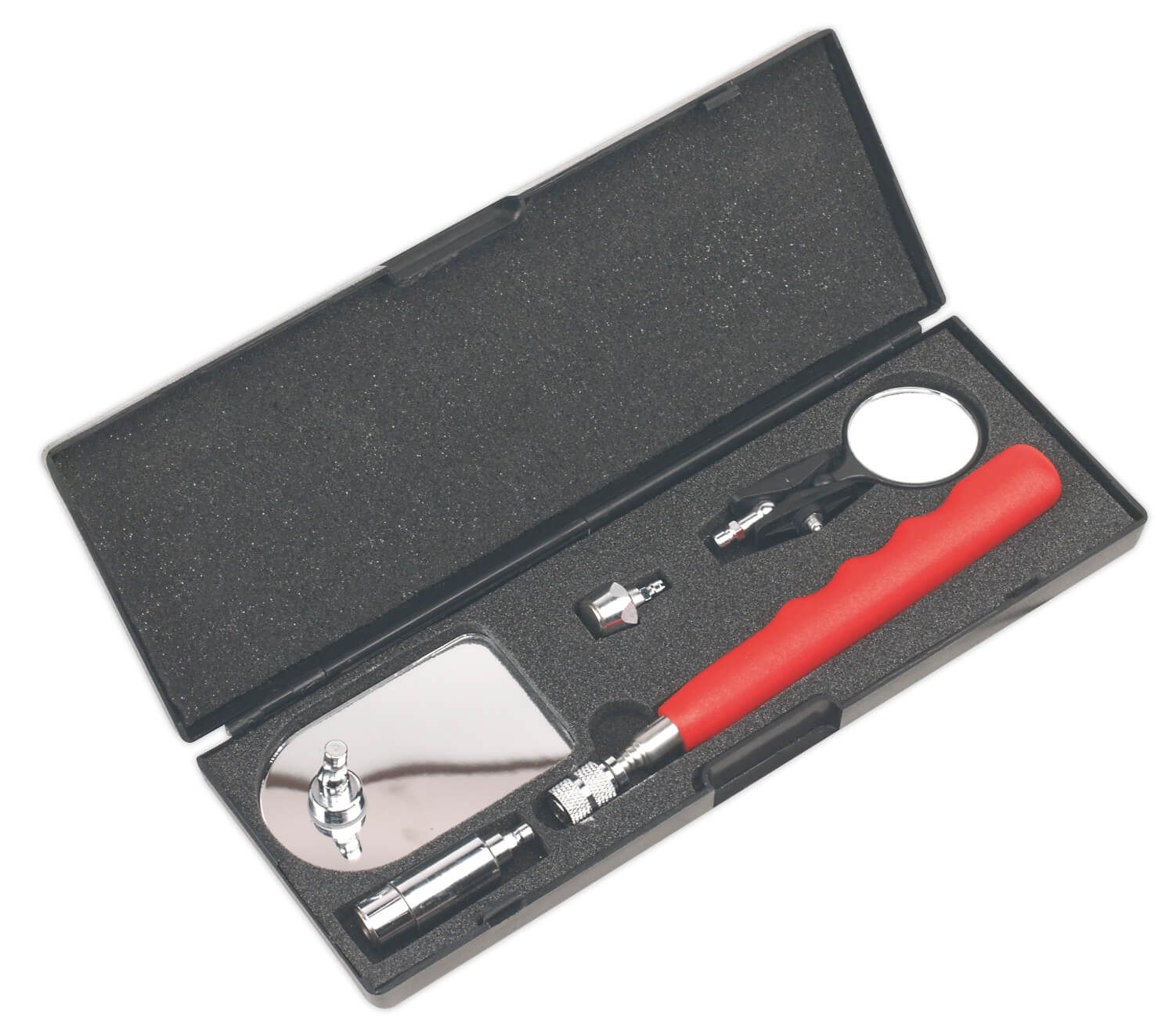 Kit includes Ø35mm inspection mirror, which is mounted on twin ball joints for maximum articulation, 50 x 80mm hinged rectangular mirror, Ø10mm magnet with 1kg capacity.