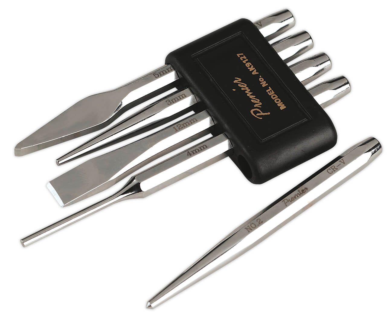 | Contents: | Centre Punch; #2 x 9.5 x 120mm, Taper Pin Punch; Ø3 x 9.5 x 120mm, Parallel Pin Punch; Ø4 x 9.5 x 150mm, Cold Chisel; 12 x 9.5 x 130mm, Utility Chisel; 5 x 9.5 x 130mm, Retaining Clip |