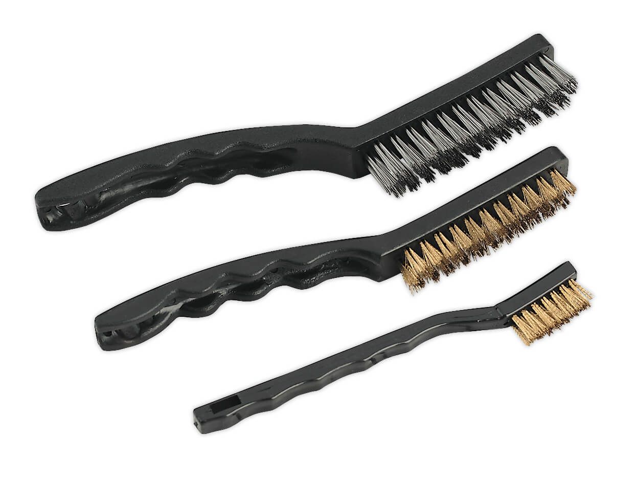 Small and medium (35 and 90mm headed) brass filled brushes for components such as glow/spark plugs and contacts and a large steel filled brush (90mm head) for removal of rust and welding slag.