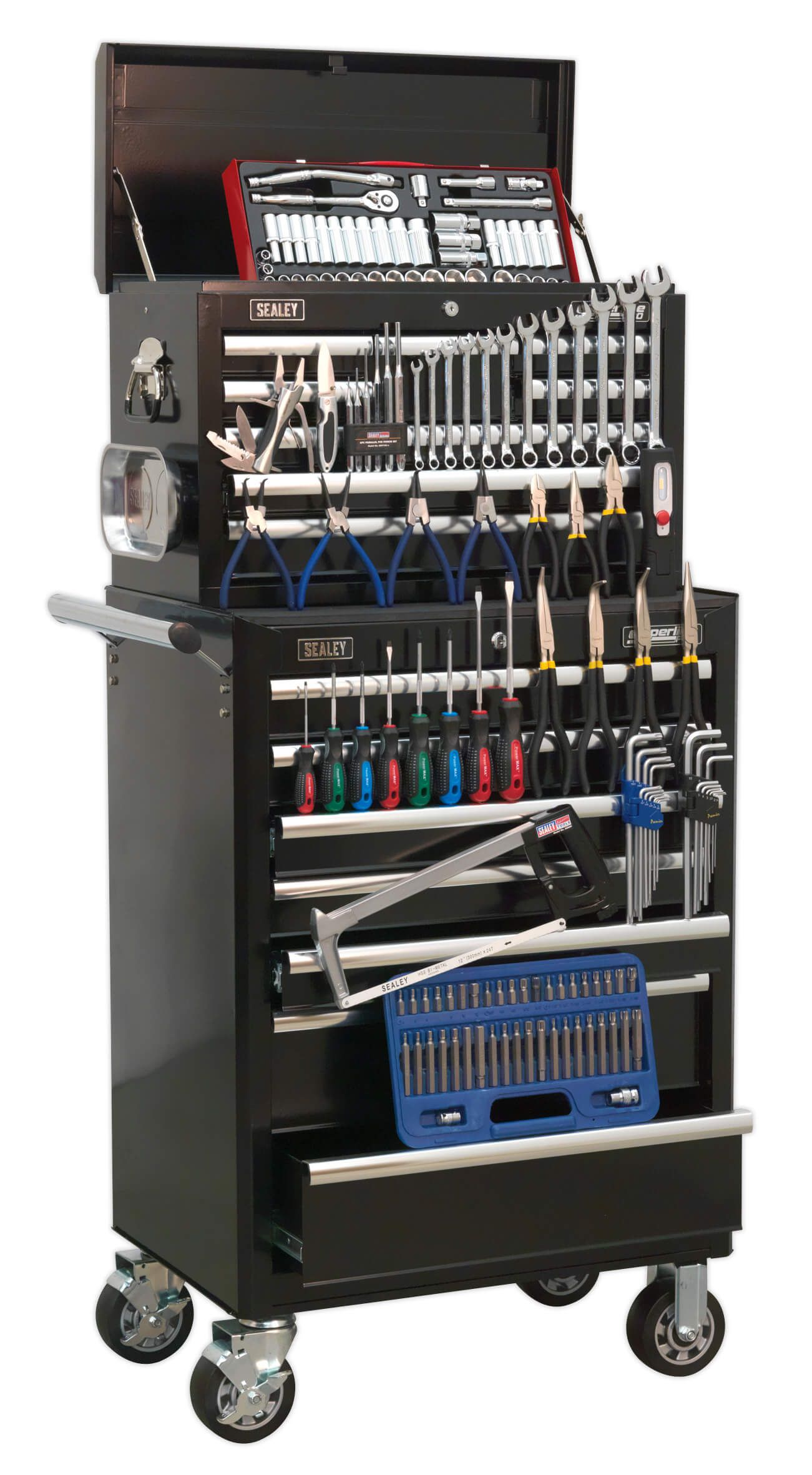 Package includes:Model No. AP33089BTopchest 8 Drawer with Ball Bearing Slides - BlackOverall Size (W x D x H): 660 x 315 x 430mmModel No. AP33479BRollcab 7 Drawer with Ball Bearing Slides - BlackOverall Size (W x D x H): 685 x 465 x 995mm147pc Tool KitModel No. - Description AK219 - TRX-Star/Spline/Hex Bit Set 42pc 3/8" & 1/2"Sq DriveAK2312 - Magnetic Collector with 2 Magnets 240 x 140mmAK5042 - Screwdriver Set 8pc PowerMAX®AK63012 - Combination Spanner Set 12pc MetricAK692 - Socket Set 45pc 3/8"Sq Drive 6pt WallDrive® - DuoMetric®AK7137 - Hex Key Set 9pc Extra-Long MetricAK7148 - TRX-Star* Key Set 9pc Extra-LongAK8440 - Circlip Pliers Set 4pcAK869 - Hacksaw 300mm ProfessionalAK9128 - Parallel Pin Punch Set 6pcAK930 - Needle Nose Pliers Set 3pc 280mm Ni-Fe FinishAK9333 - Pliers Set 3pc Ni-Fe FinishAK69/S - Aviation Tin Snips Straight CutLED3602G - Rechargeable 360 Inspection Lamp 7 SMD+3W LED Lithium-ion GreenPK1 - Pocket Knife LockingPK10 - Multi-Tool 10 FunctionOther products of equivalent value will be supplied in the event that the promotion items should cease to be available.You may also refer to the individual Model No. for full specification.