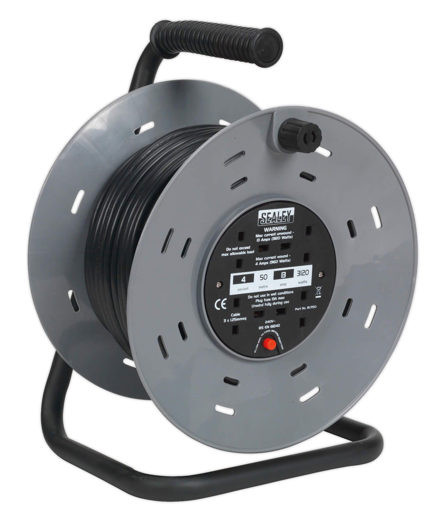 Sealey BCR50 Cable Reel 50mtr 4 x 230V 1.25mm² Thermal Trip