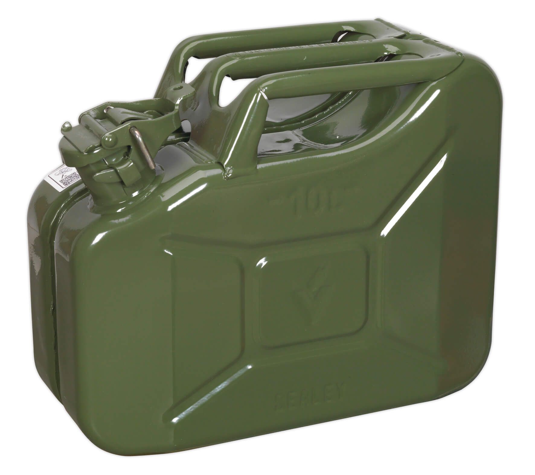 - Green jerry can with 10ltr capacity manufactured from 0.9mm pickled steel sheet with fuel resistant lining.