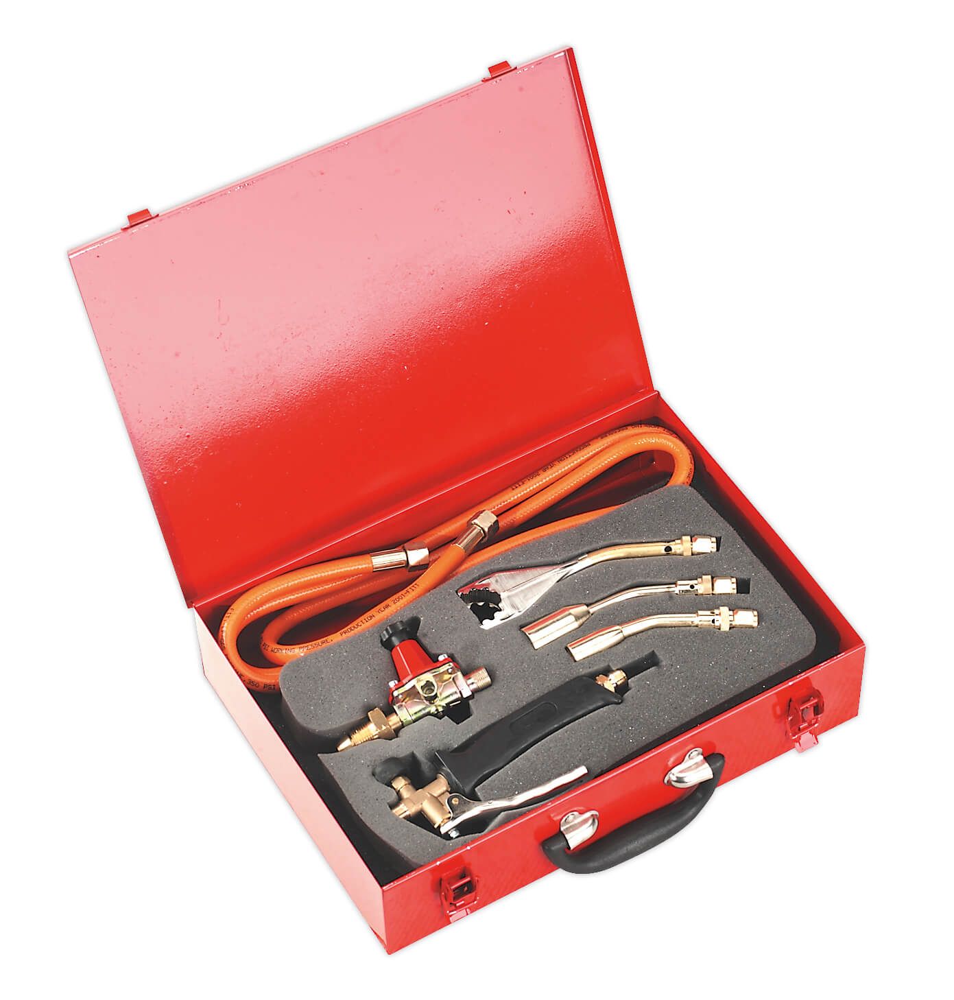 - Supplied with 2mtr rubber hose, propane regulator and selection of nozzles in metal carry-case.