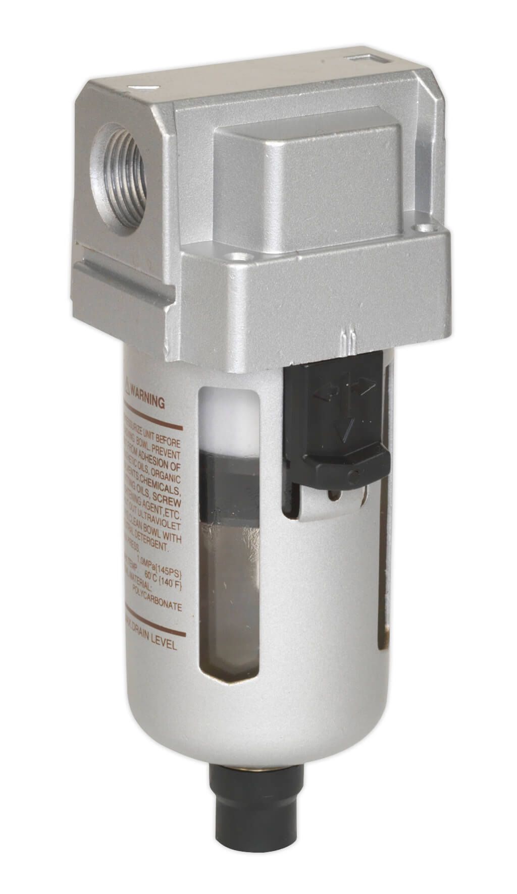 • Filter is fitted with automatic drain tap and metal bowl cage for protection.