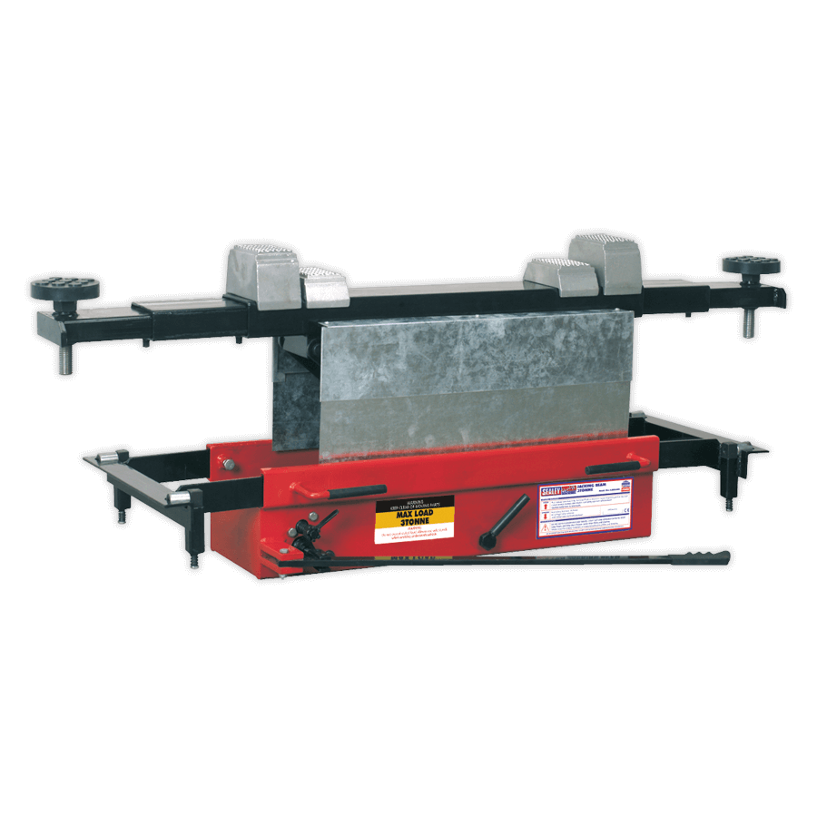 Beam has spring loaded flat arms with roller bearings - when unloaded, these support the weight of the beam, allowing the entire unit to run smoothly along the pit or ramp, but when loaded, they firmly stabilise the unit.