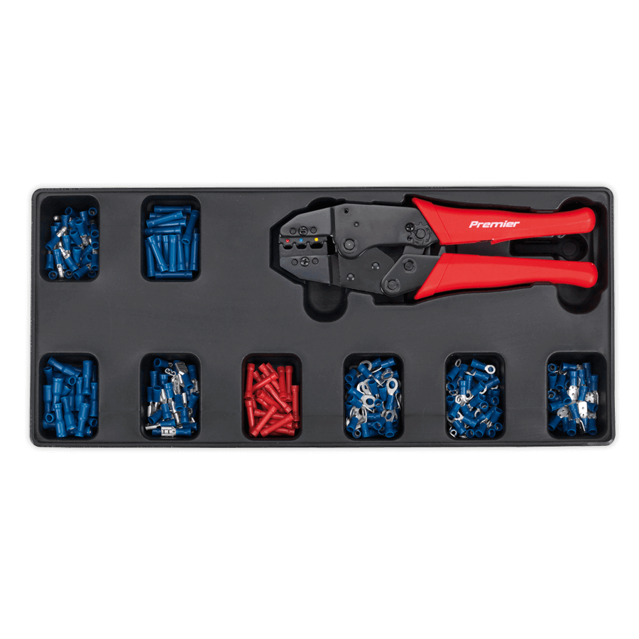 Ratchet Crimper, 325 Assorted Insulated Terminals; Male Blade Blue 6.3mm Size 16-14 (x50), Female Blade Blue 6.3mm Size 16-14 (x50), Butt Red Size 22-16 (x25), Butt Blue Size 16-14 (x25), Ring Blue 3mm Size 16-14 (x50), Ring Blue 5mm Size 16-14 (x50), Male Bullet Blue Size 16-14 (x50), Female Bullet Blue Size 16-14 (x25)