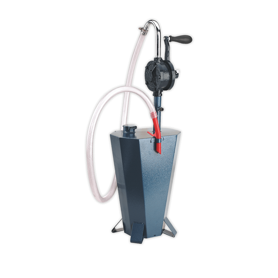 - Rotary type pump with clear, plastic tube delivers and retrieves oils and fluids.