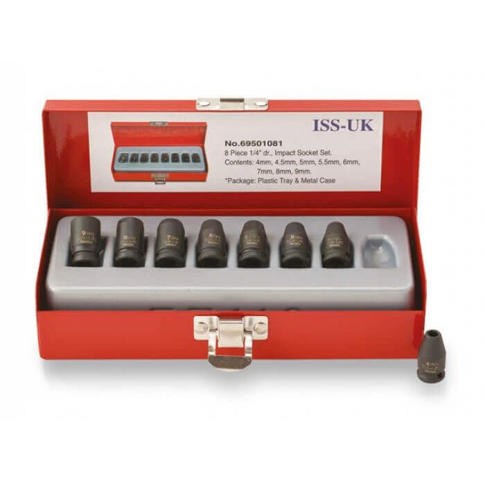 8 Piece Metric Impact socket set, forged from chrome vanadium steel hardened, tempered and chemically blacked for corrosion protection. These sockets are for use with air, electric or manual impact wrenches. Supplied in steel storage case.