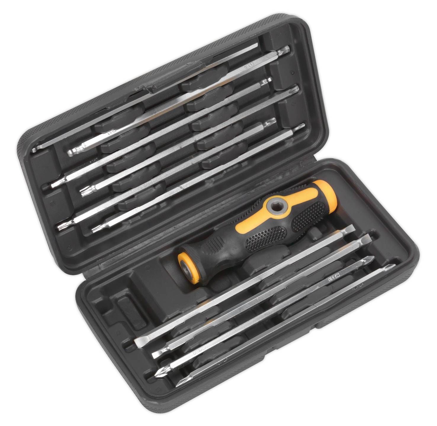 Supplied with ten Chrome Vanadium double end driver bits in storage case.