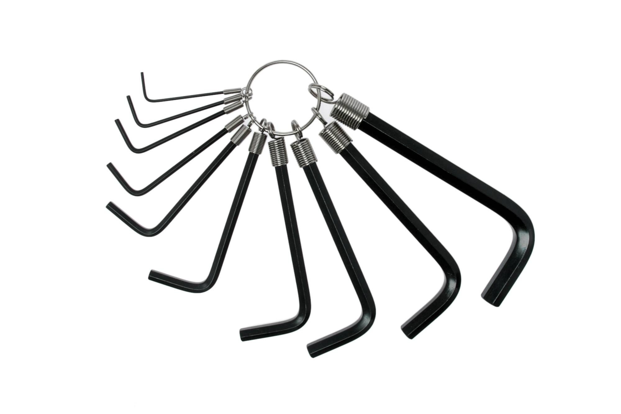 10 piece black metric hex key set containing 10 hex keys and a holding ring. Made from chrome vanadium steel.
