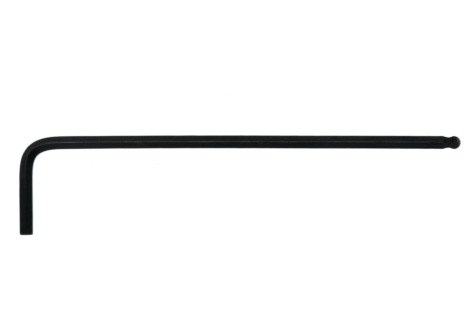 Individual black hex key wrench. Features a ball point head on the long end which permits turning at a 30° angle. Made from chrome vanadium.