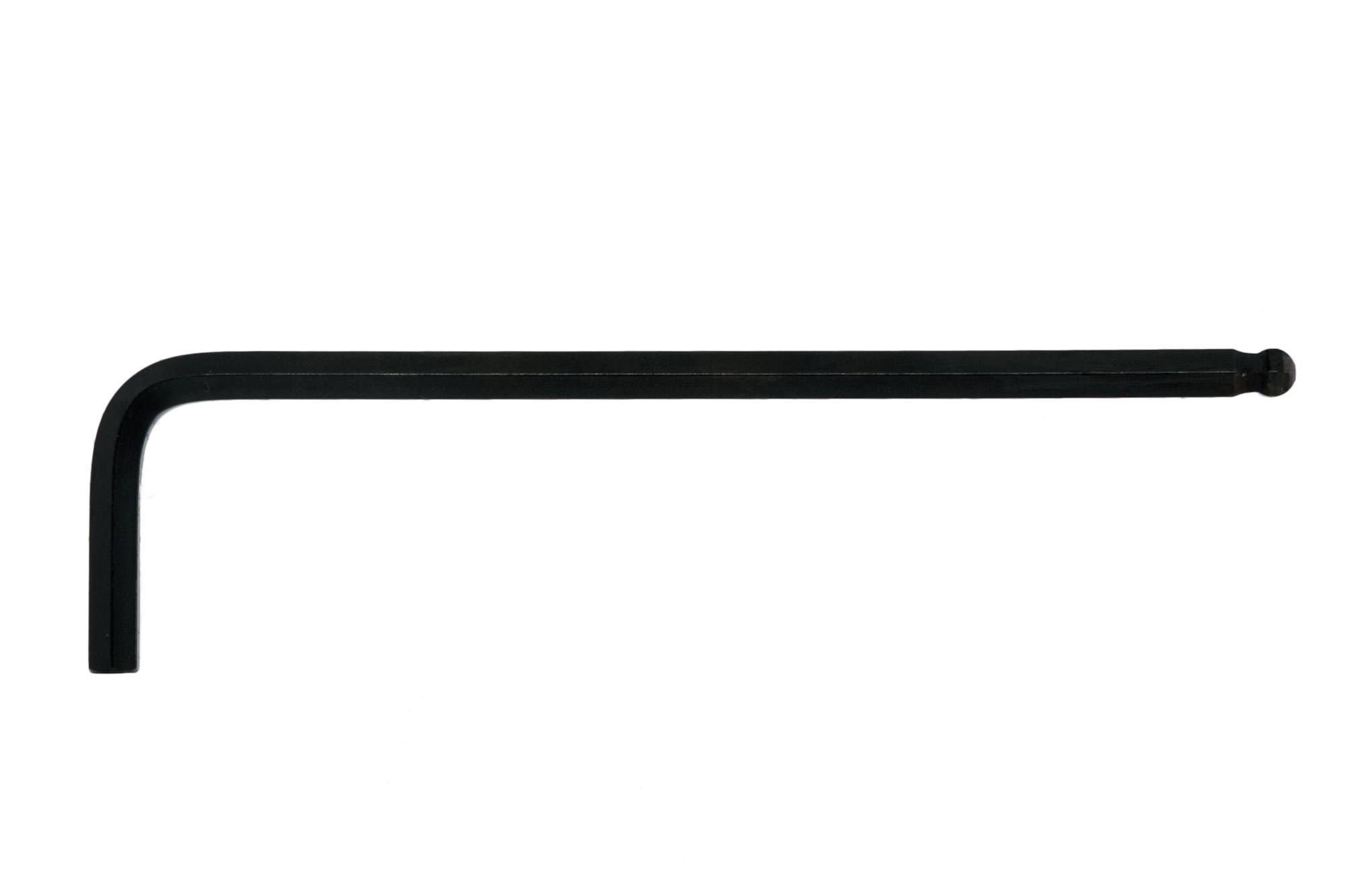 Individual black hex key wrench. Features a ball point head on the long end which permits turning at a 30° angle. Made from chrome vanadium.
