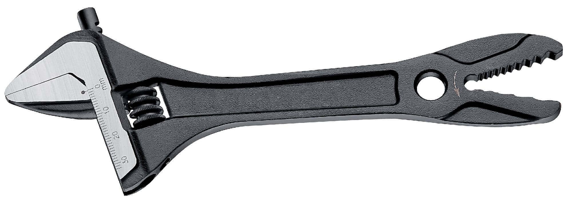 A very handy 8" adjustable wrench featuring a pipe grip on one end with a capacity of M2 to M8 and a regular Teng Tools adjustable wrench jaw at the other with a jaw capacity of 32mm (1 3/8"). The jaw has a gauge and is set at a 15° angle for easier use. No part of the jaw movement protrudes making it ideal for use in confined spaces. A hanging hole enables a safety hook to be fitted for fall arrest or for hanging on a work bench panel. The wrench is made from chrome vanadium with a phosphate finish. A service kit for the jaw mechanism is also available (Product Code: 4003JRK).