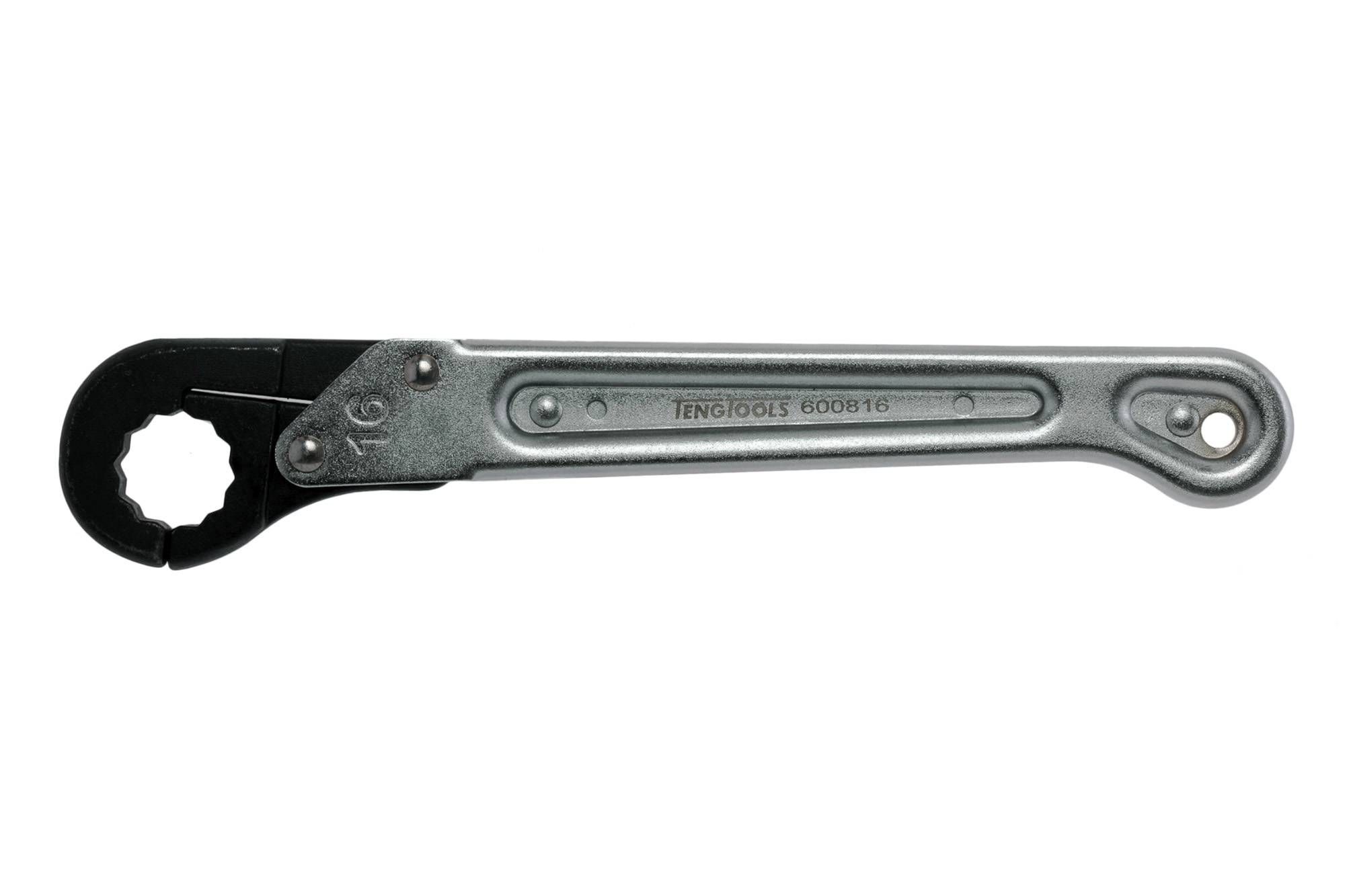A wrench specifically designed for loosening and tightening pipe and hose couplings. Ideal for use in confined spaces. The ring ratchet has a clever design so that it opens up to easily access the nut on the coupling.