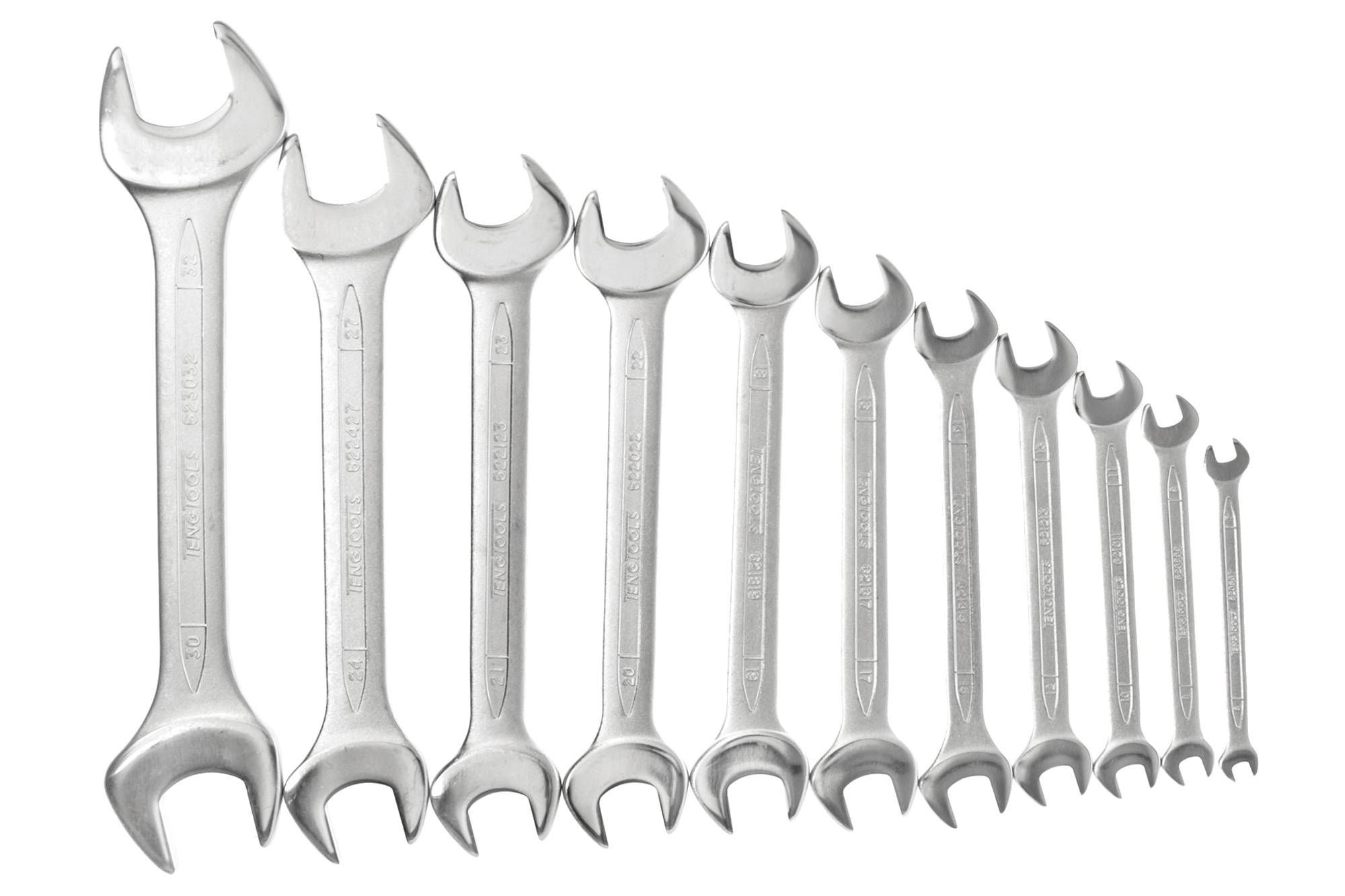 11 piece metric double open ended spanner set with different size dimensions at each end. The spanners feature polished heads and a satin finish and are supplied in a coloured display box. DIN 3110 ISO 3318.