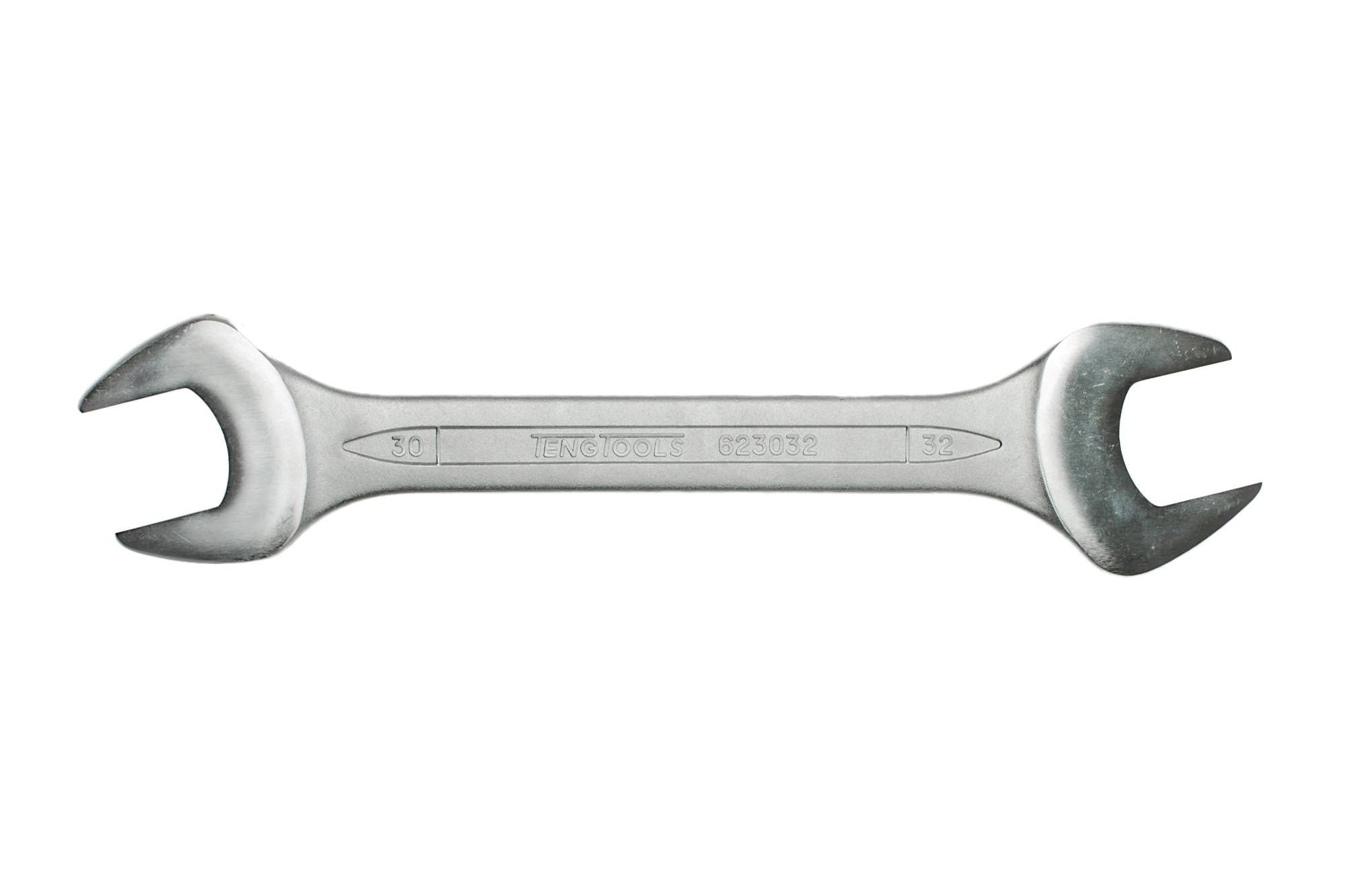 Double open ended metric spanner. Different dimensions at each end and offset at 15°. Made from chrome vanadium with a satin finish. DIN 3110.