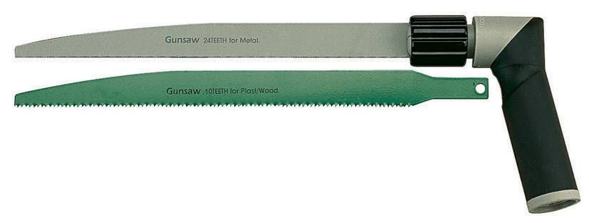 3 piece gun saw set complete with a 24 teeth blade for cutting metal and a 10 teeth blade for cutting wood or plastic. Features include an ergonomically designed grip with a 4 position locking mechanism.