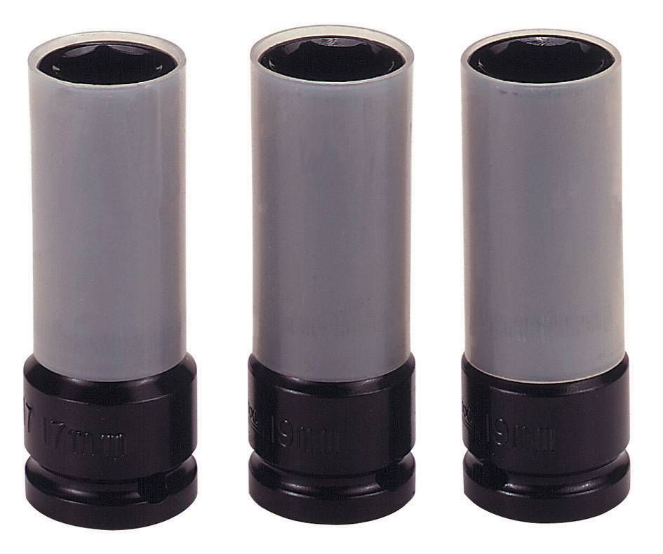 1/2" drive 17mm, 19mm and 21mm 6 point deep metric impact sockets. To be used for wheel nuts. Made in chrome molybdenum with a black finish and protective inserts for use on aluminium wheels. Supplied as a set of three.