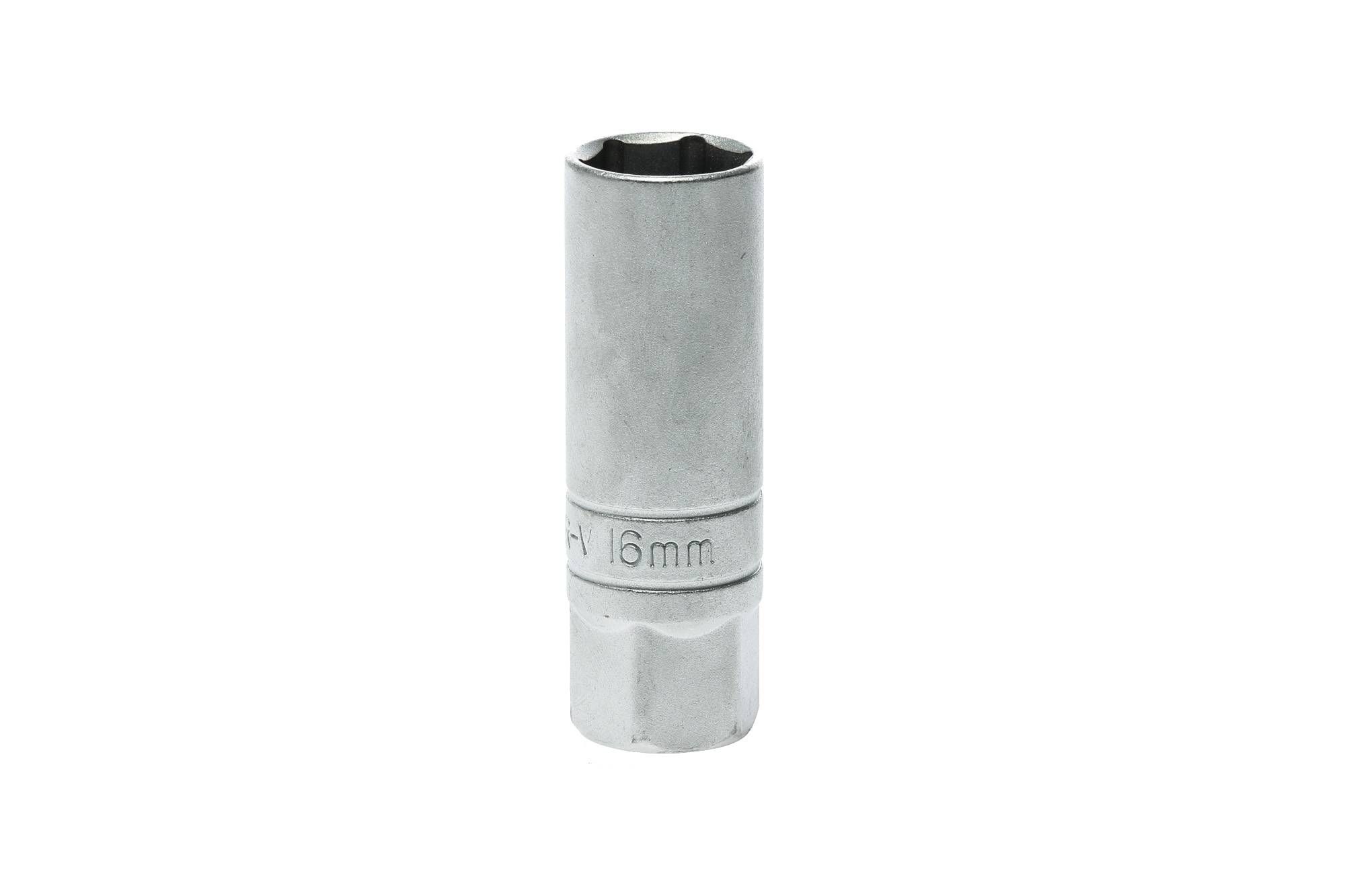 3/8" drive 6 point 16mm spark plug socket made from chrome vanadium with a satin finish and rubber insert.