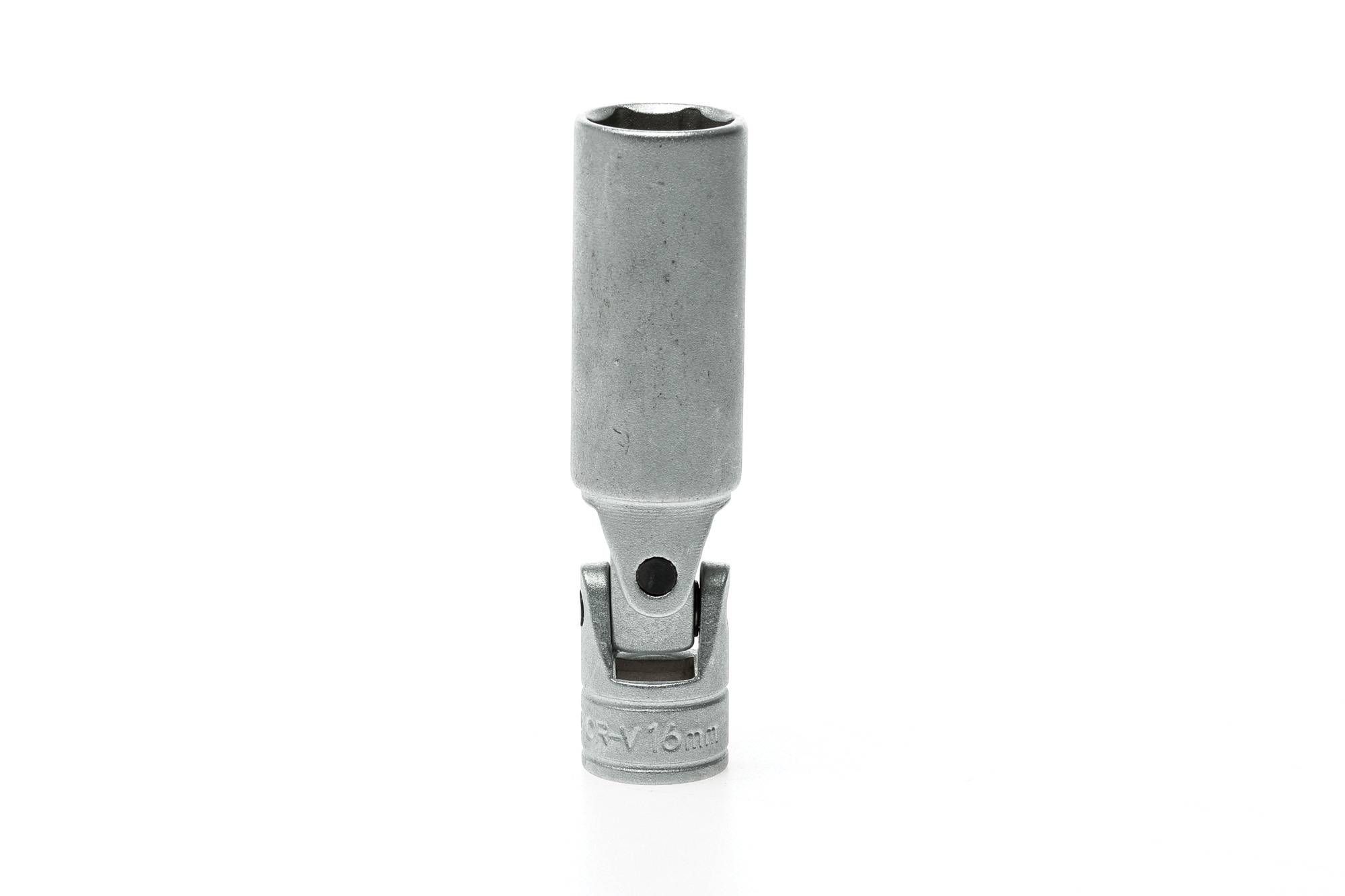 3/8" drive 6 point 16mm flexible spark plug socket made from chrome vanadium with a satin finish and rubber insert.