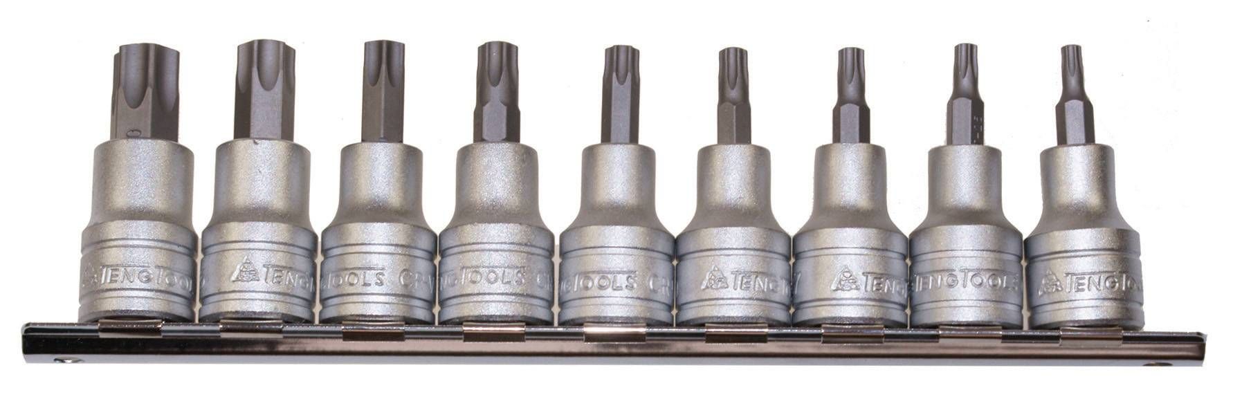 9 piece 3/8" drive TPX sockets for internal tamper TPX heads supplied on a clip rail.