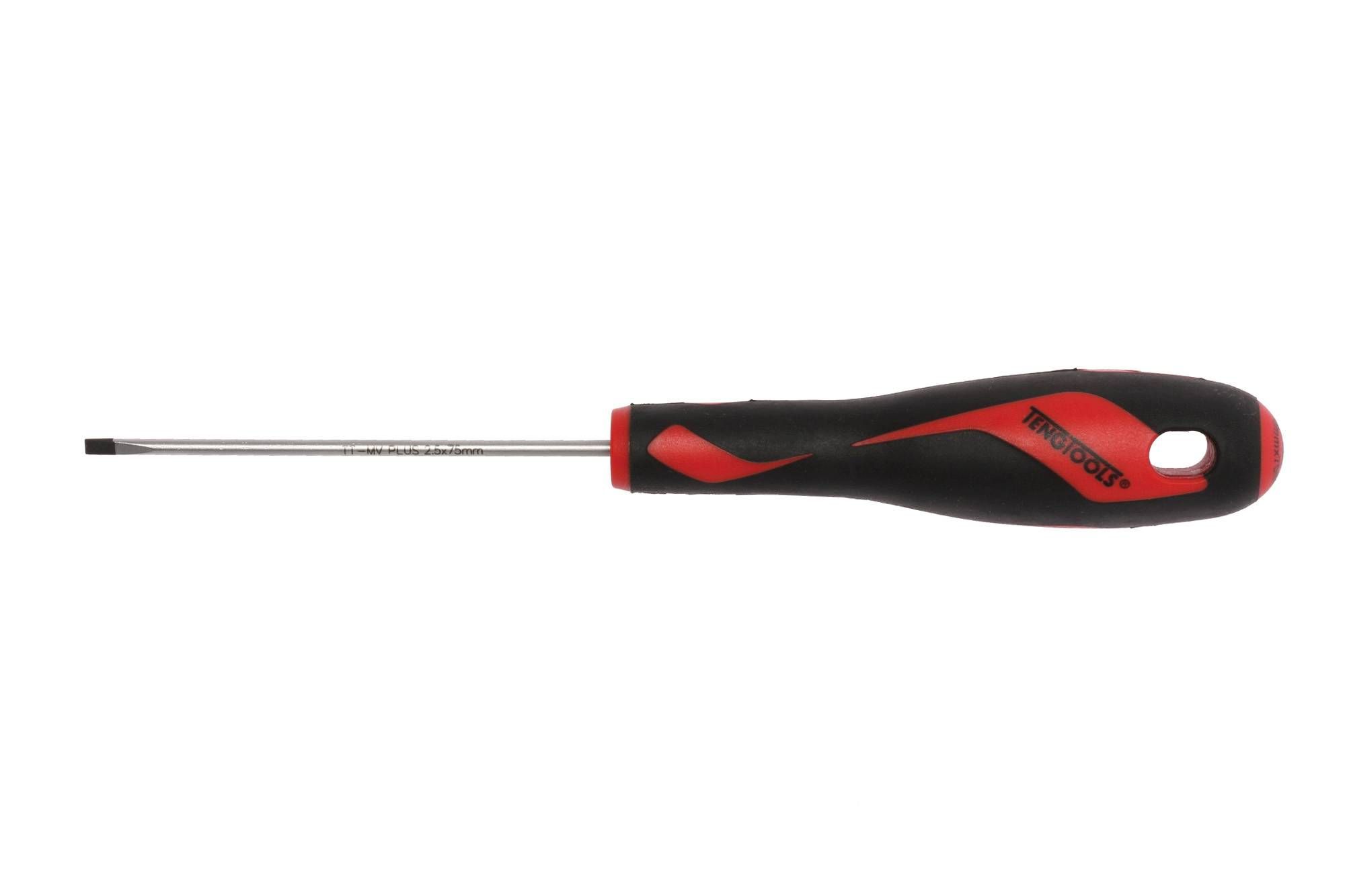 Flat screwdriver with an ergonomically designed two component handle with hanging hole. Made from chrome vanadium with a black tip. DIN 5264.