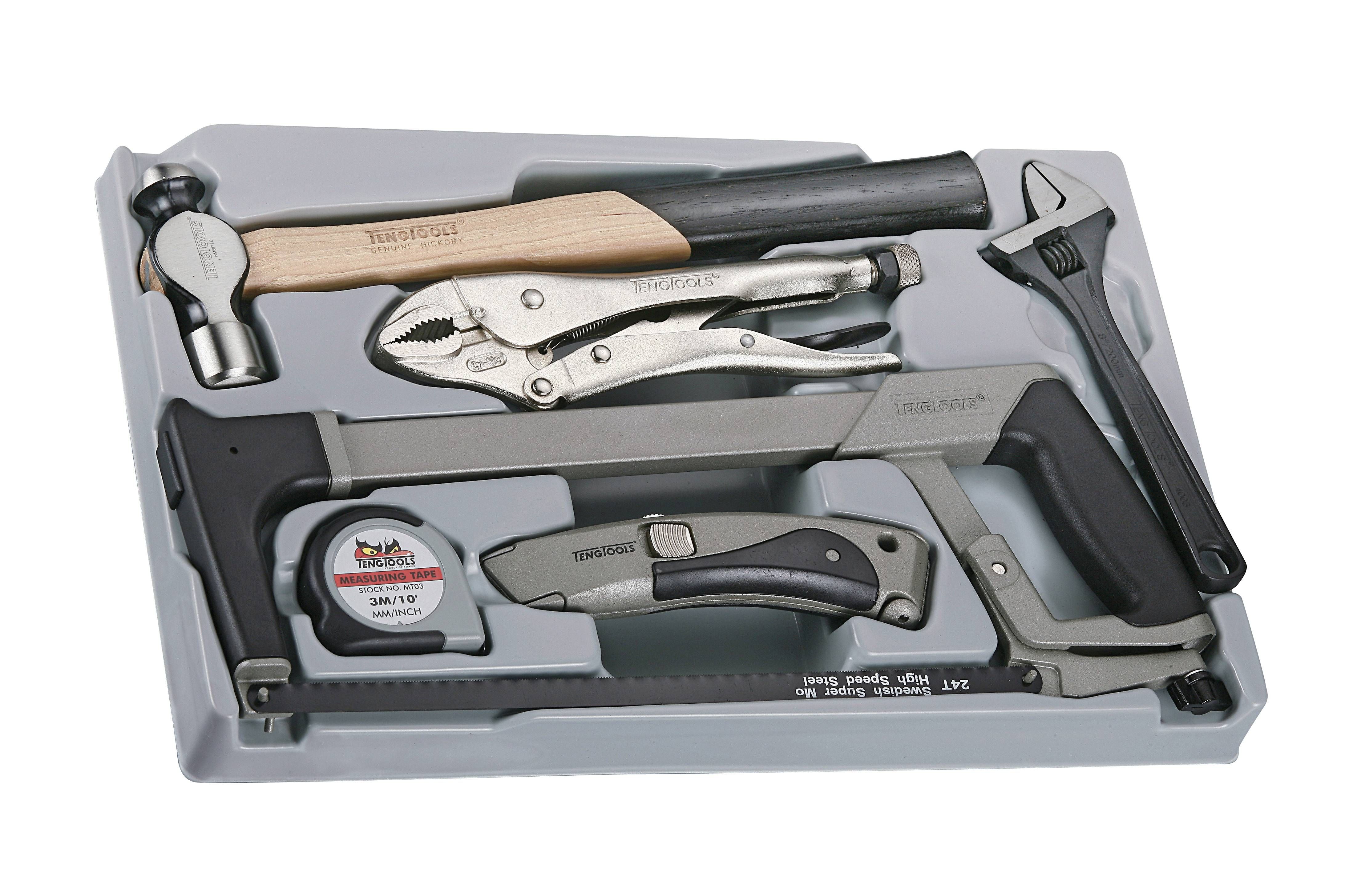 Service tray with 3 meter measuring tape, 12” hacksaw frame, utility knife, 10” power grip plier, 8” adjustable wrench and a 16oz ball pein hammer. Supplied in a PS tray to fit in the Teng Tools TC-SC service case (as shown in picture). (570x265x56mm, 2.5 kilos)
