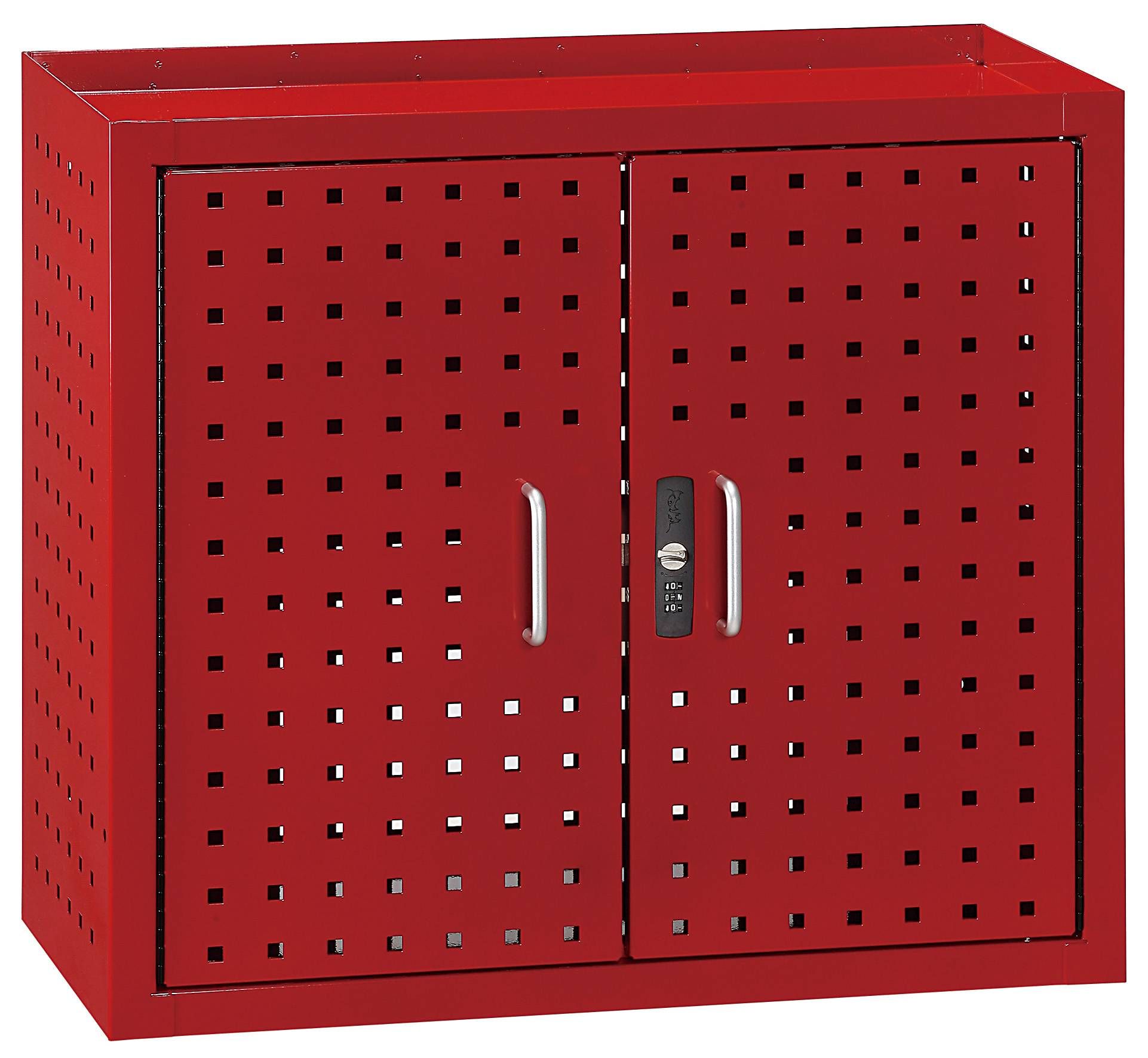 Fully lockable wall mounted tool cabinet equipped with a combination lock. The inside panel features square peg holes which follows the same system as the work bench panels and roller cabinet side plates outlined in the Teng Tools range.