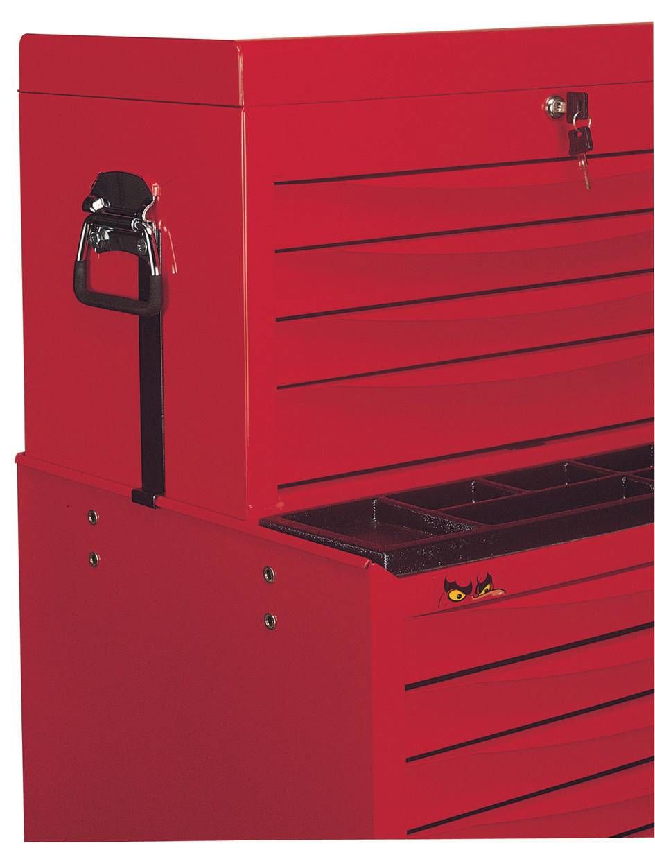 This set of brackets is used to secure a top box to a roller cabinet and prevent it from tipping when moving from one location to another.