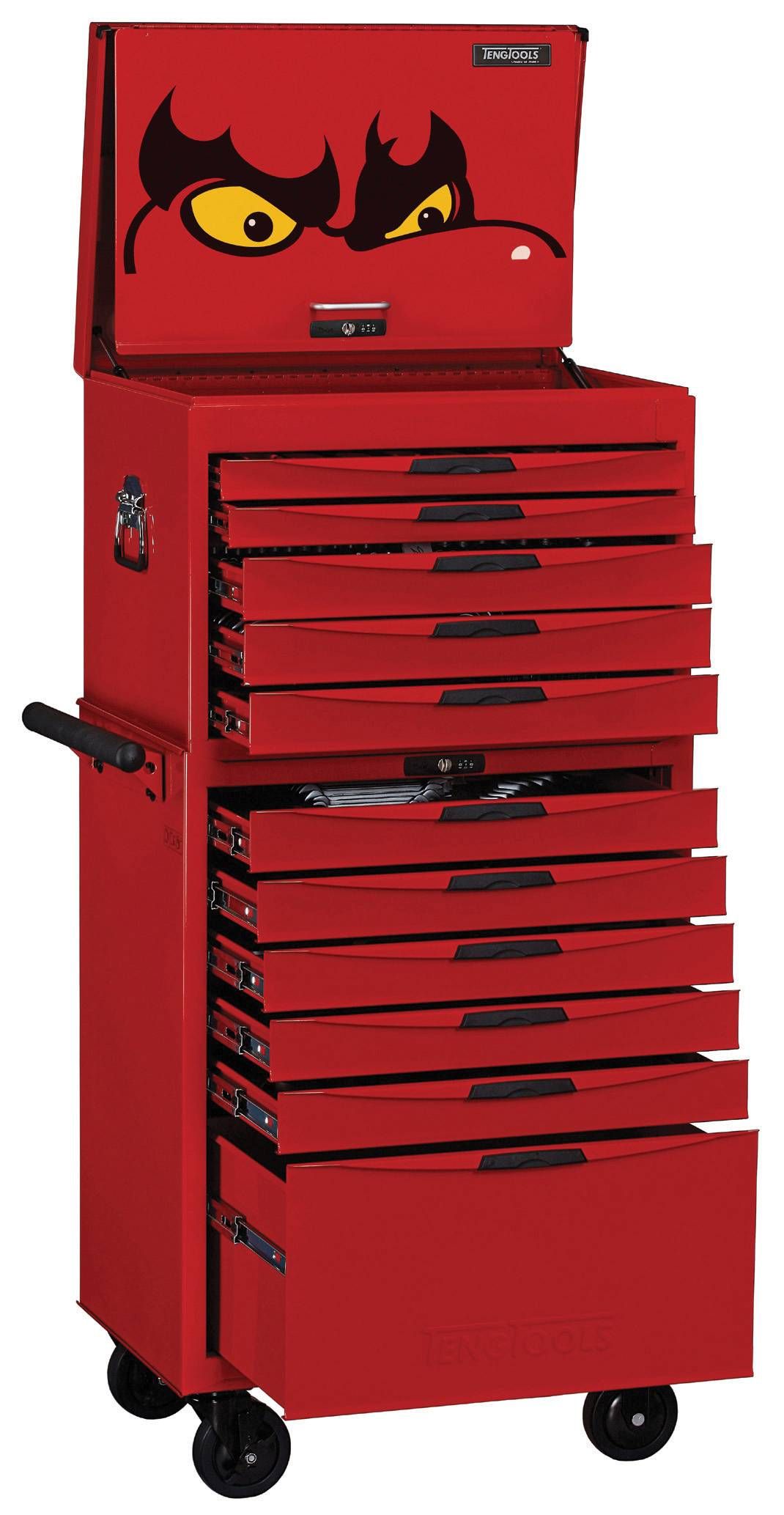 A comprehensive 530 piece tool kit with all the tools laid out in two colour pre-cut EVA foam which clearly shows if any tools are not in their correct place. The tool kit is supplied in the Teng Tools TC805NFX full depth drawer top box and TCW806N1 6 drawer roller cabinet, all with ball bearing slides. The Teng Tools EVA control system provides a cost effecive solution for ensuring that all the tools have been returned to their correct place in the tool box at the end of a shift or job. Each tool is scanned in a CAD CAM system and a computer controlled milling machine mills the exact shape of the tool into a two colour EVA block. The top layer of the block is black and the bottom layer red so that as soon as a tool is taken out, the shape of the tool is clearly visible in red. The EVA block is etched with the size or description of the tool next to it's position so that if a tool is missing not only can the space be clearly seen but the missing tool cna be identified quickly - making it much easier to recall where the tool may have been used or left.