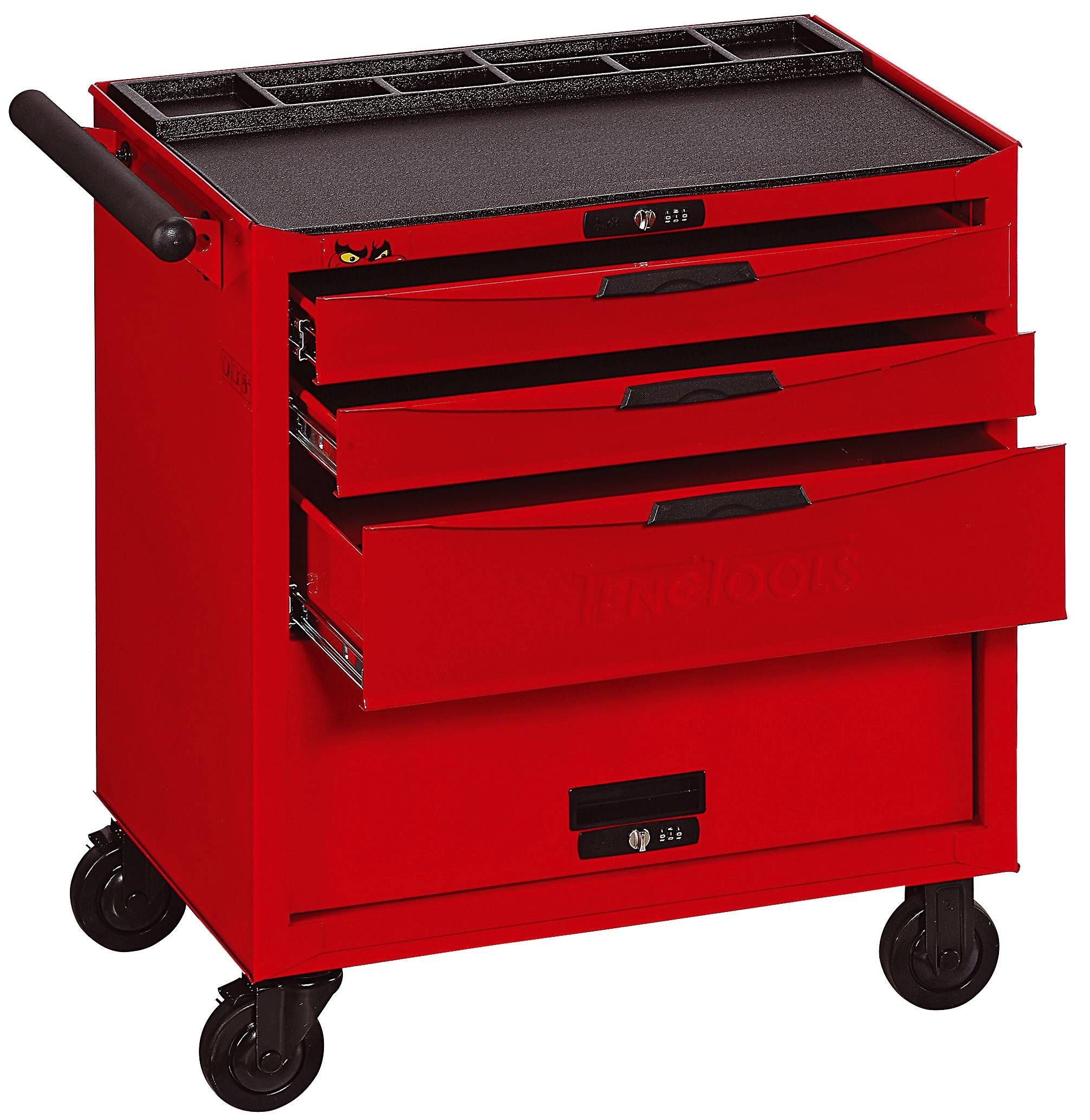 3 drawer 8 series roller cabinet with two fixed castors and two swivel castors with brakes. Equipped with 3 lockable drawers fitted with ball bearing slides with a lockable storage area below. Combination lock included.