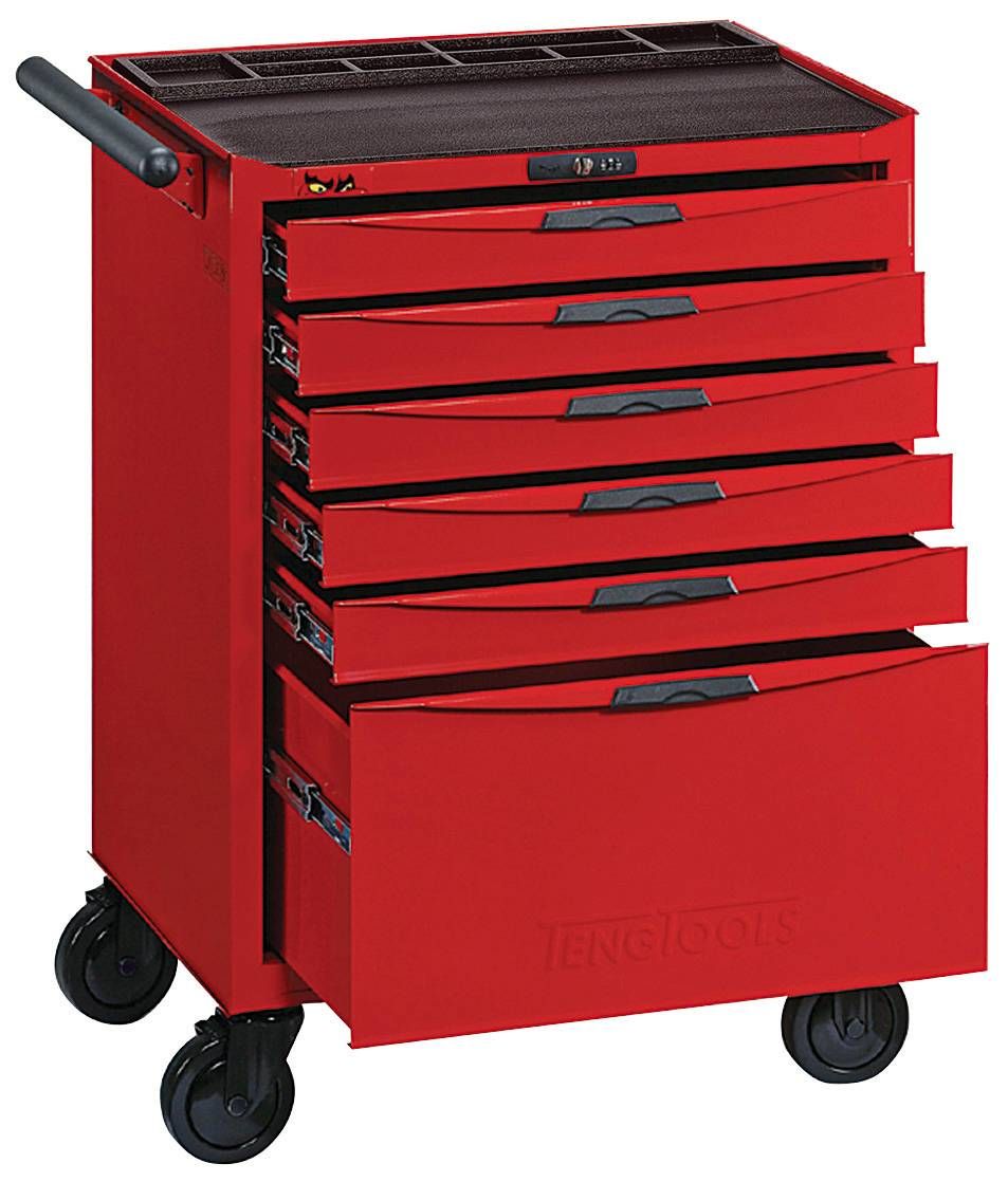 6 drawer 8 series roller cabinet with two fixed castors and two swivel castors with brakes. Equipped with 6 bearing mounted drawers with a combination lock, heavy-duty handle for transporting and an ABS top mat equipped with a small compartment. Each drawer has a protective mat in the bottom.
