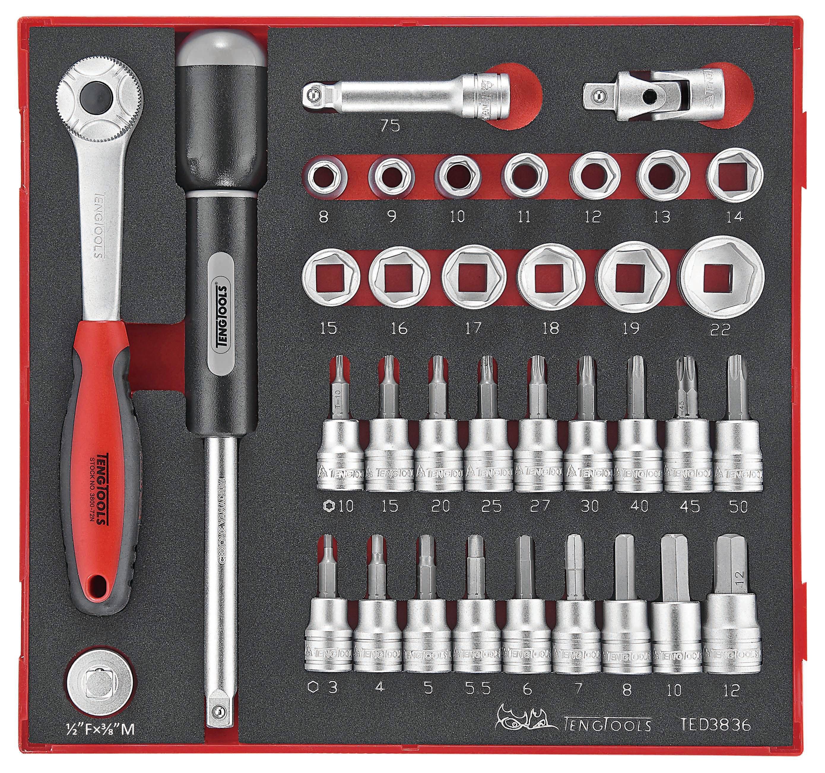 36 piece set containing 3/8" drive regular and bit sockets and a range of accessories. The set is supplied in a unique Teng Tools TC tray and can be used either on it's own or as part of the Teng Tools TC control system. The tray features a removable hinged click lock lid and dove tail joints which enable different TC trays to be locked together and used as trays in Teng Tools tool boxes and roller cabinets. The tools are held in place using the Teng Tools two colour pre-cut EVA foam which has been computer milled to house each specific tool. The top layer of the foam is black and the bottom layer is red so that as soon as a tool is taken out, the shape of the tool is clearly visible. The EVA foam is also etched with the size or description of the tool next to it's position so that if a tool is missing not only can the space be clearly seen but the missing tool can be identified quickly. (265x284x50mm).