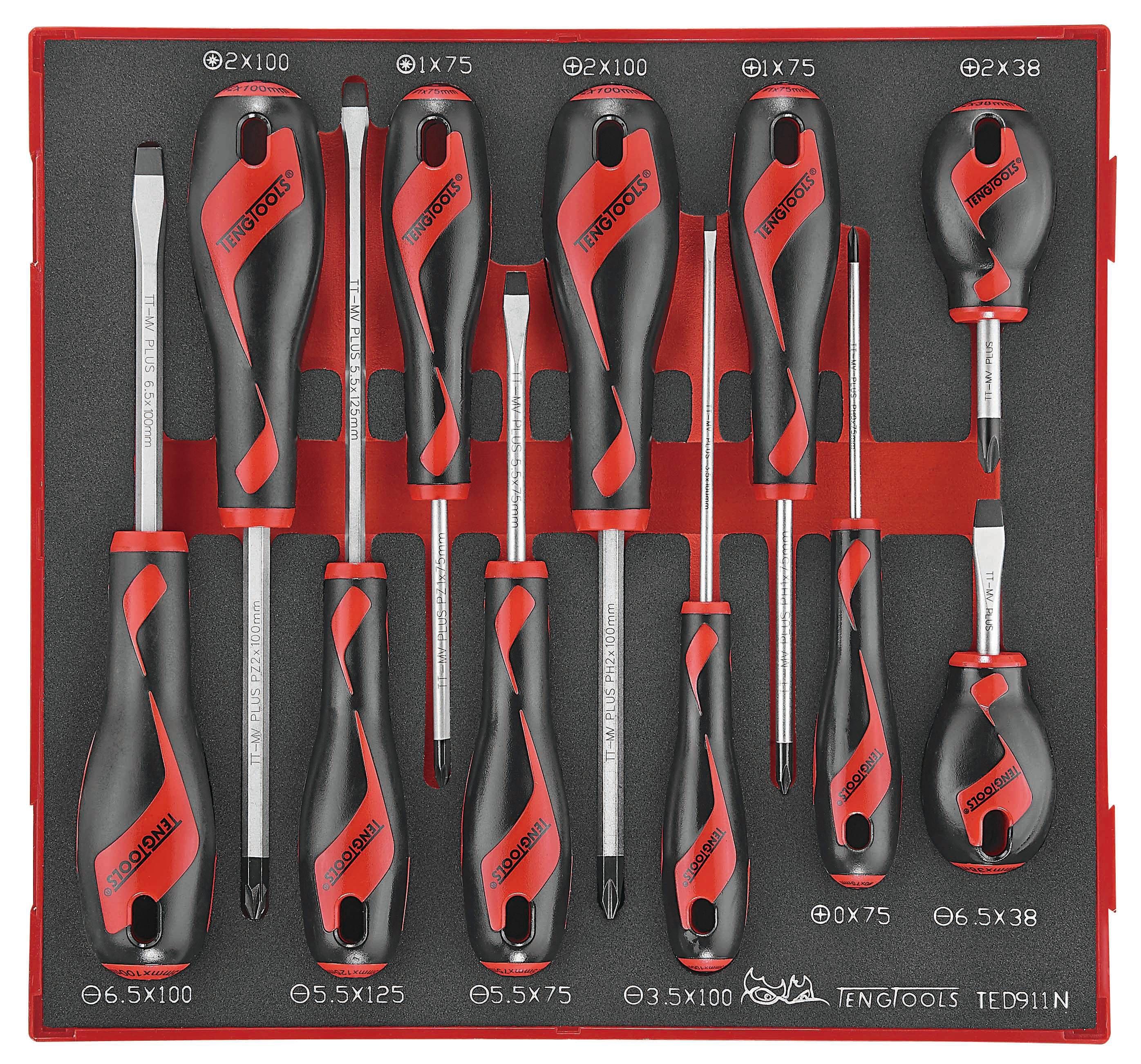 11 piece flat, PH and PZ screwdriver set. The screwdrivers feature TT-MV PLUS steel, black tips and ergonomically designed two component handles with hanging holes. The set is supplied in a unique Teng Tools TC tray and can be used either on it's own or as part of the Teng Tools TC control system. The tray features a removable hinged click lock lid and dove tail joints which enable different TC trays to be locked together and used as trays in Teng Tools tool boxes and roller cabinets. The tools are held in place using the Teng Tools two colour pre-cut EVA foam which has been computer milled to house each specific tool. The top layer of the foam is black and the bottom layer is red so that as soon as a tool is taken out, the shape of the tool is clearly visible. The EVA foam is also etched with the size or description of the tool next to it's position so that if a tool is missing not only can the space be clearly seen but the missing tool can be identified quickly. (265x284x50mm).