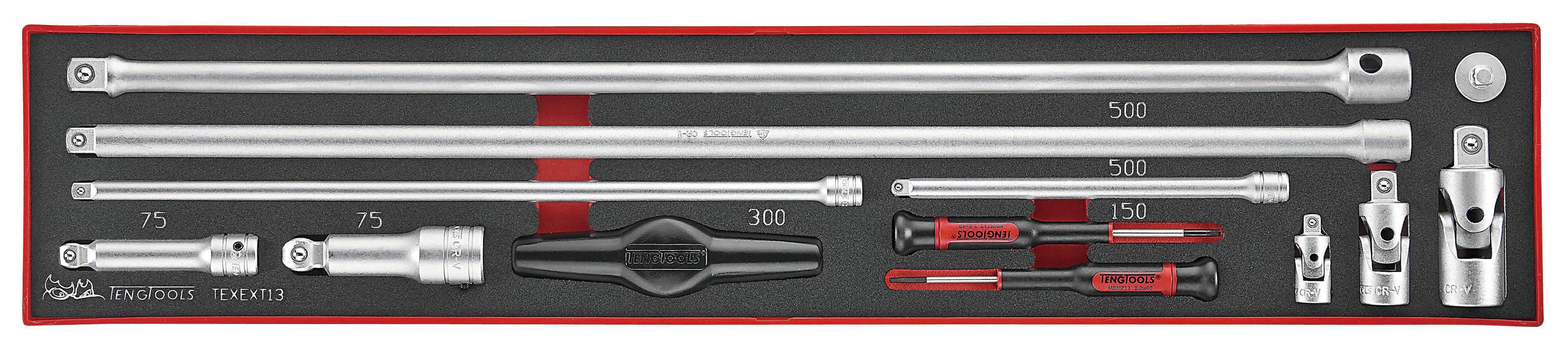 13 piece extension and socket accessory set. The set is supplied in a unique Teng Tools drawer width TTX tray and can be used either on it's own or as part of the Teng Tools TC control system. The tray features a removable hinged click lock lid and dove tail joints which enable different TC trays to be locked together and used as trays in Teng Tools tool boxes and roller cabinets. The tools are held in place using the Teng Tools two colour pre-cut EVA foam which has been computer milled to house each specific tool. The top layer of the foam is black and the bottom layer is red so that as soon as a tool is taken out, the shape of the tool is clearly visible. The EVA foam is also etched with the size or description of the tool next to it's position so that if a tool is missing not only can the space be clearly seen but the missing tool can be identified quickly. (560x110x40mm).