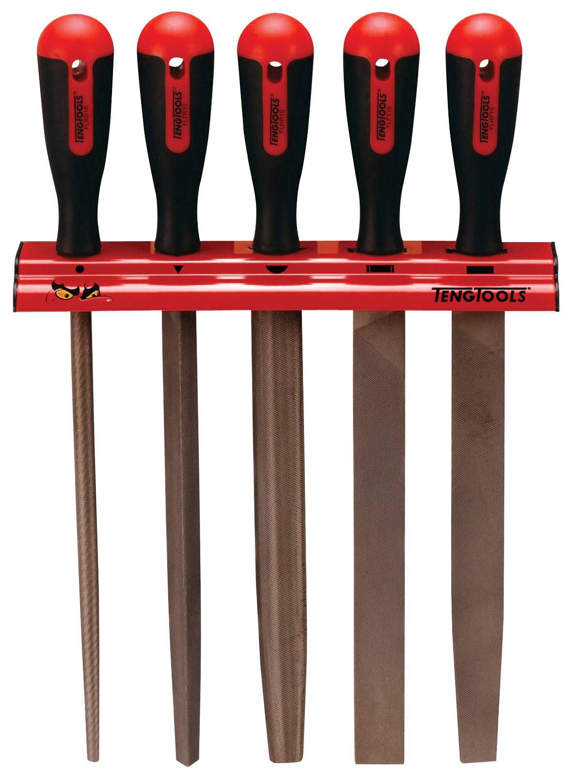 A set of 5 10" files including flat, hand, half round and three square files. The set is supplied complete with a wall rack for fixing to the wall or a workbench.